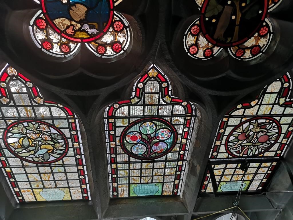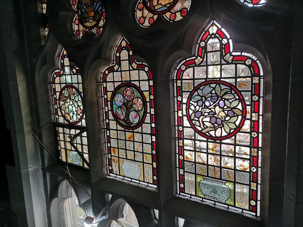 These two contemporary stained glass roundels celebrate the 2020-23 restoration of the Town Hall.