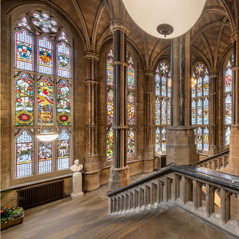 This space looks and feels more like a church or cathedral than a public building. However, instead of telling bible stories, the nine sets of stained glass windows celebrate Rochdale as a trading town, highlighting its commercial connections across the British Isles and the world.