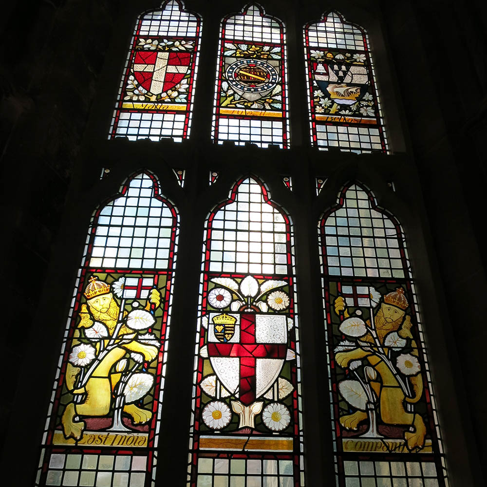 One of the vertical stained glass panels on the steps to the Great Hall, bears the name of the East India Company. The first delegation of businessmen from the East India Company landed at a port in India in 1604. They set up trade centres in Bengal and Gujarat and expanded their businesses to other parts of India as well.