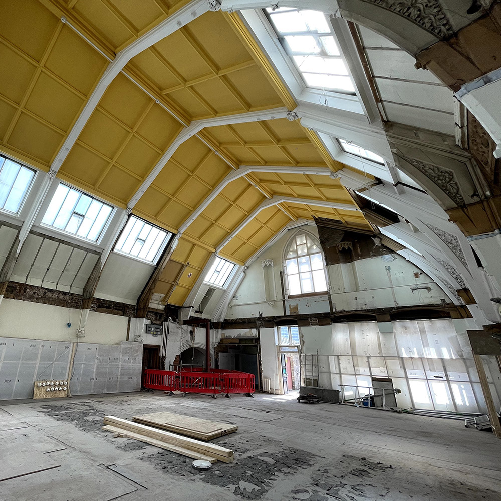 Created to house Rochdale’s first Free Library, the space and many of the books were destroyed by the fire in 1883. The fire and later alterations have left little sign of the original decoration. The walls were painted with a rose pattern, the beams gleamed with gold and other colours. The original stained glass windows have survived. They feature Gutenberg, the inventor of printing and Cadmus, inventor of writing.