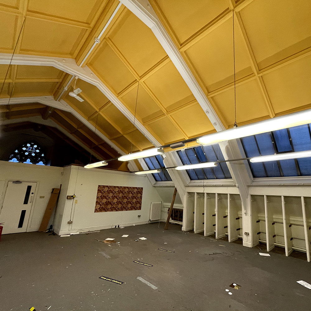 When the mezzanine floor and office partitions were removed, it became clear that there was something missing in the Bright Hall! The lower section of one of the carved wooden roof beams, and the angel at the foot of it, were nowhere to be seen.