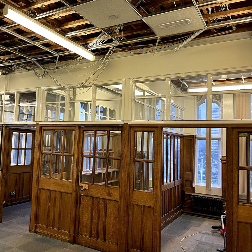 This room was originally Rochdale’s first free, public library. After the clocktower fire in 1883, it saw many changes and additions. In 1958 a mezzanine floor was added to make more office space. This completely changed how the space looked.
